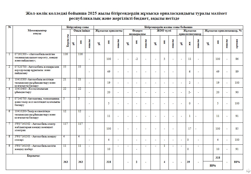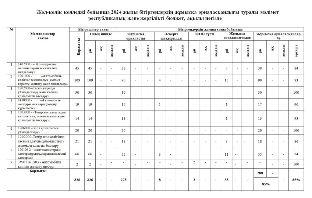 КОЛЛЕДЖ БІТІРУШІЛЕРІНІҢ ЖҰМЫСҚА ОРНАЛАСУЫ ТУРАЛЫ МӘЛІМЕТ